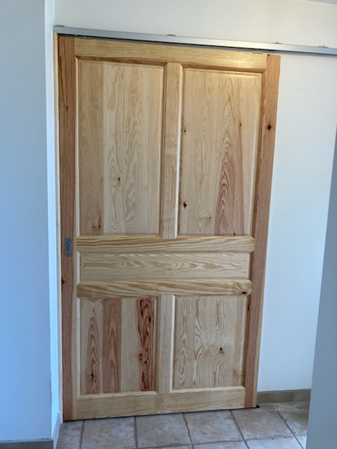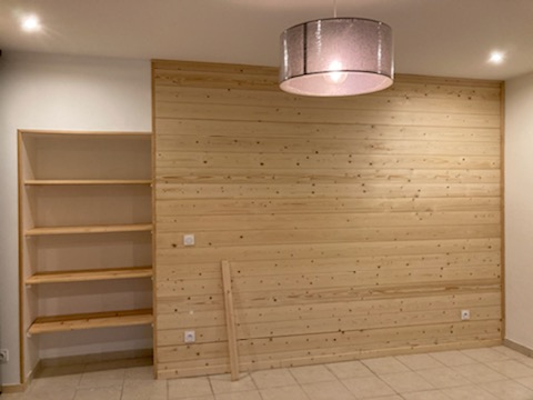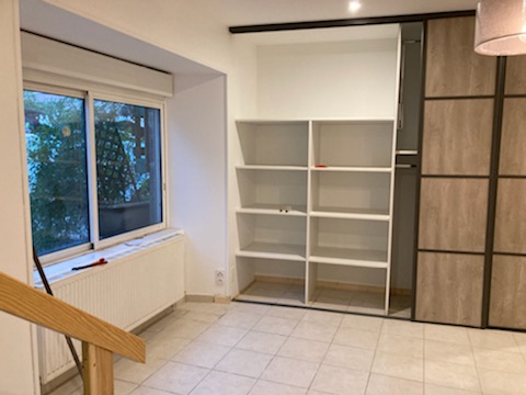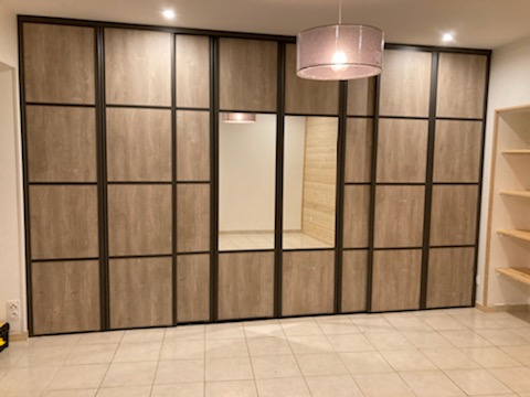 Réalisation et pose d’un dressing sur mesure (portes et étagères de rangement) avec optimisation des espaces pour une meilleure installation.